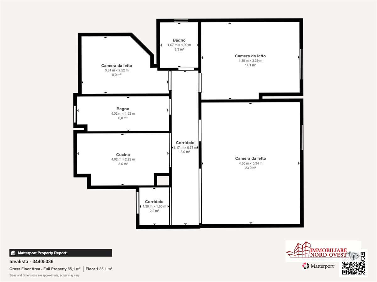 Luminoso e spazioso, con una superficie di 100 mq, dispone di una cucina abitabile, due camere da letto, due bagni e due balconi.