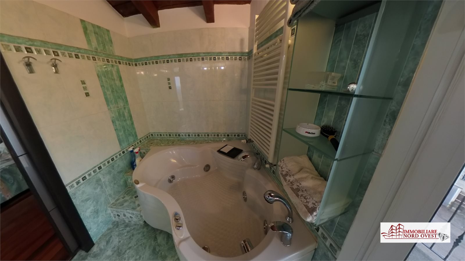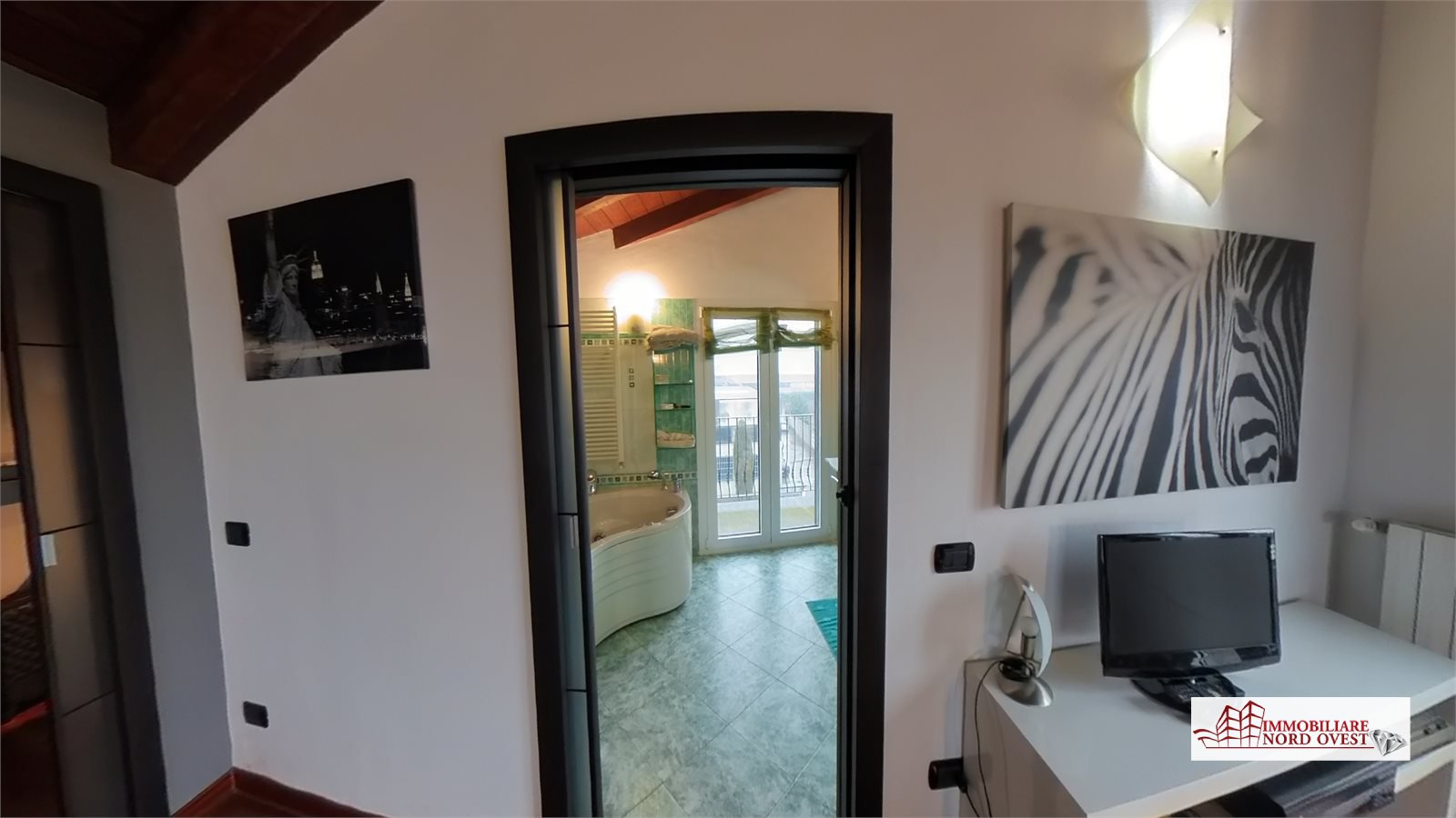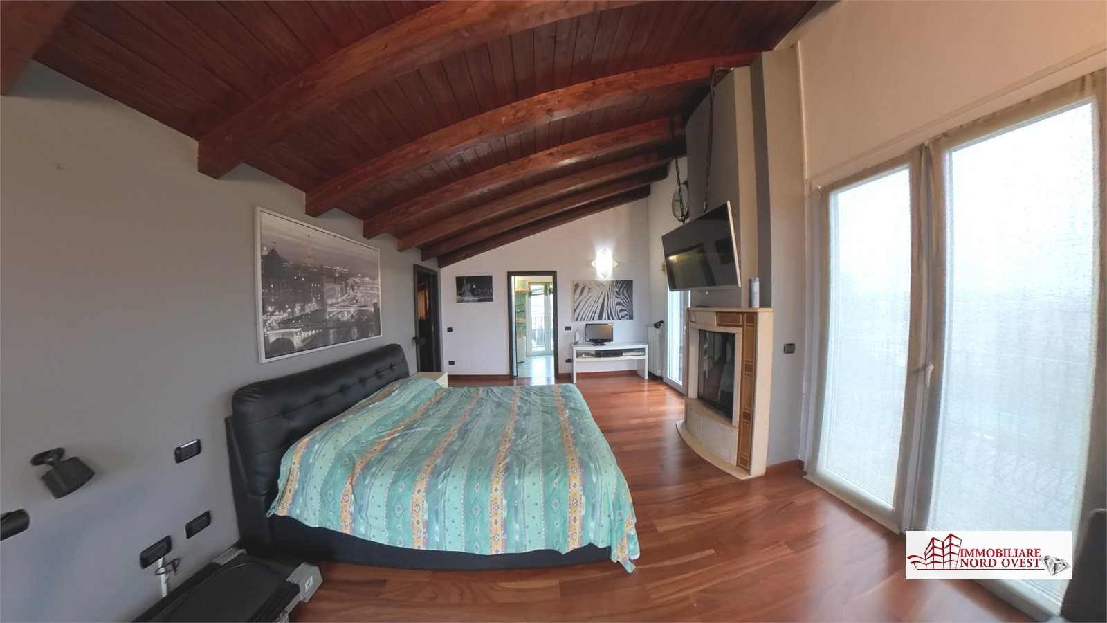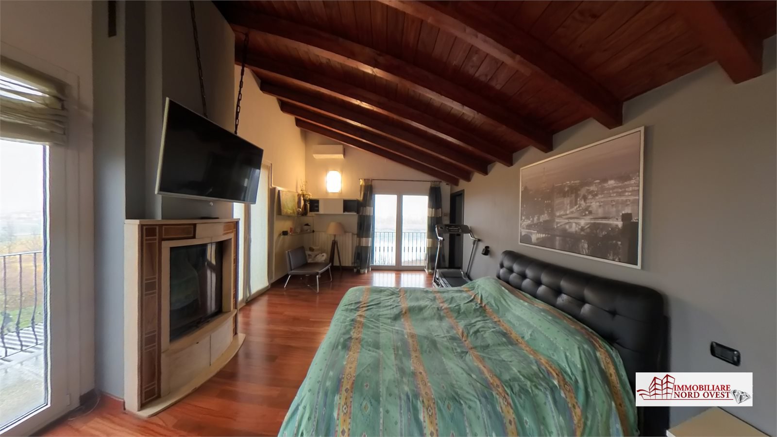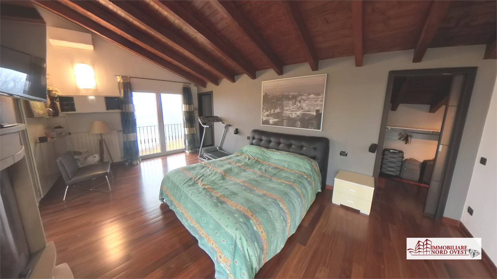Al secondo piano affascinante locale openspace attualmente adibito a camera matrimoniale, caratterizzato da travi a vista e dotato di camino, cabina armadio, bagno con vasca idromassaggio e ampia balconata.